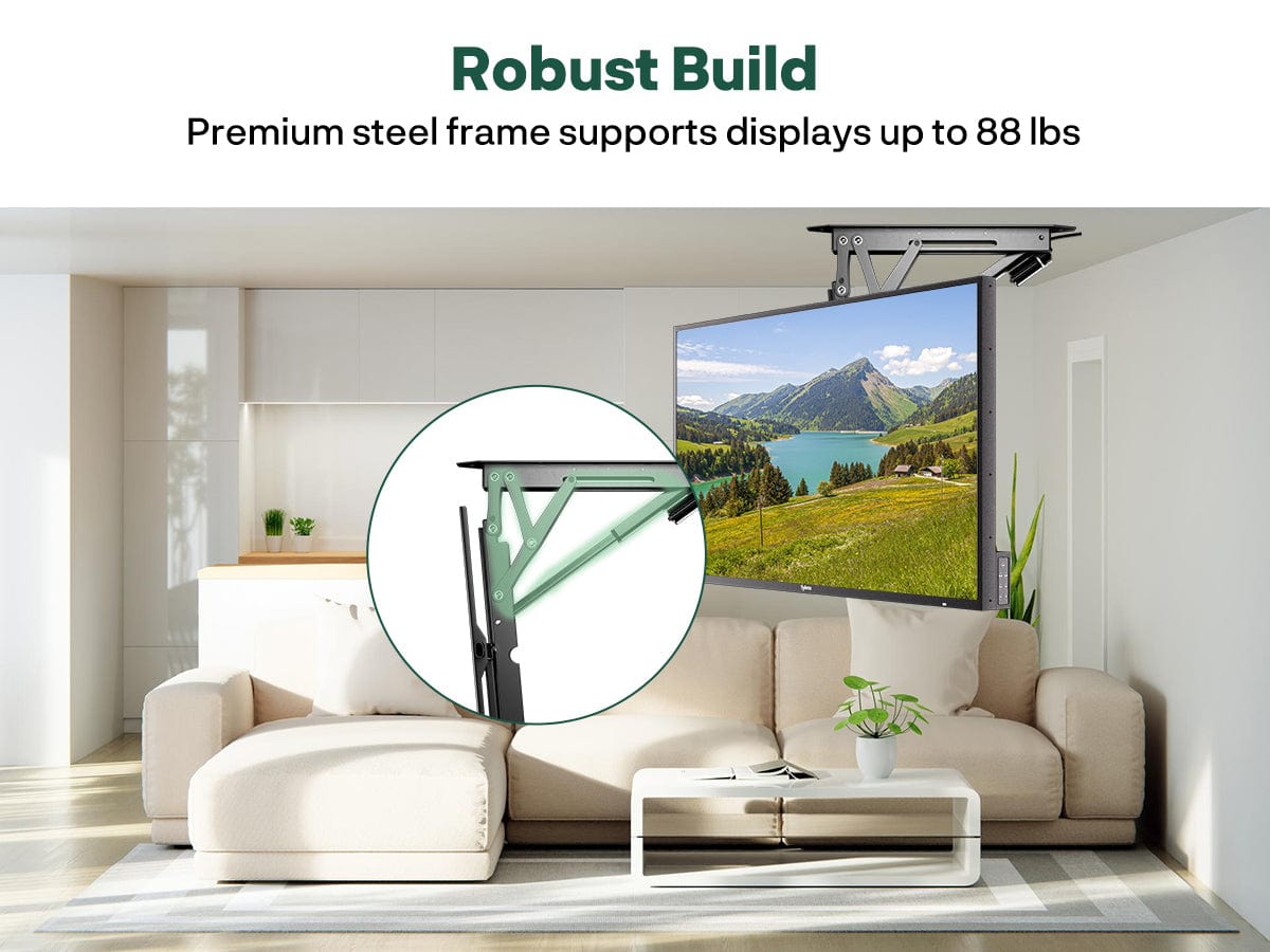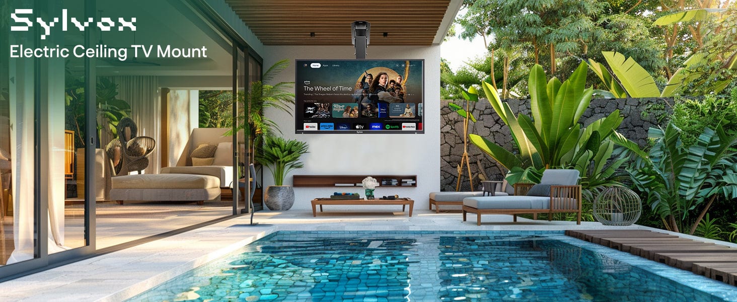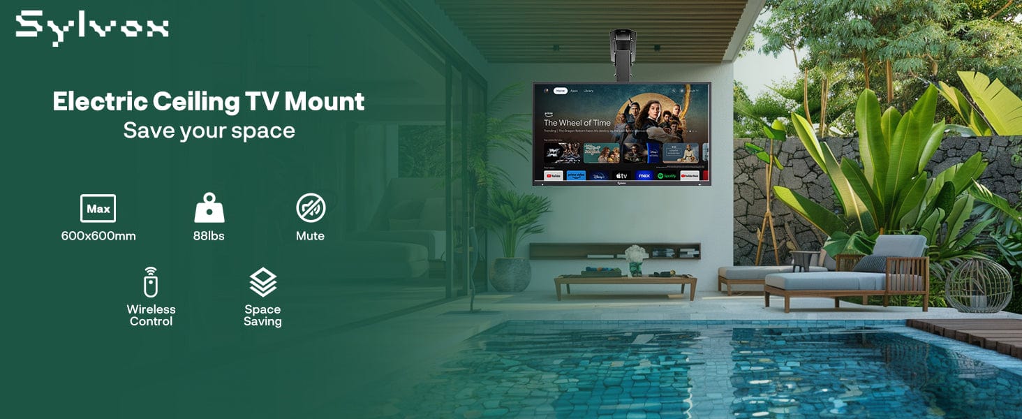 Motorisierte Outdoor TV Deckenhalterung – Wetterfest, Elektrisch Klappbar mit Fernbedienung